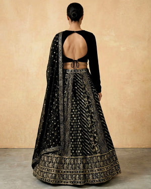 Black Banarasi-Brocade Faux-Mirror-Embroidery Box-Pleated Lehenga, Velvet Blouse & Dupatta Set.