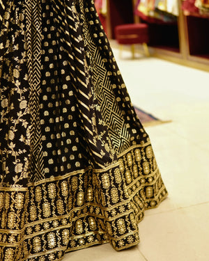 -Product Name: Black Banarasi-Brocade Faux-Mirror-Embroidery Box-Pleated Lehenga, Blouse & Dupatta Set.
