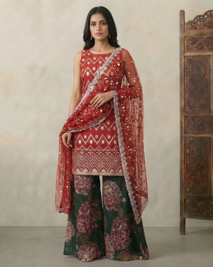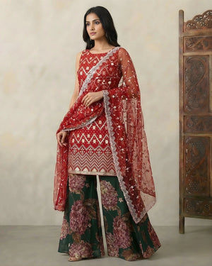 Blood-Red Banarasi-Brocade-Sequin-Embroidery Kurti , Floral Palazzo & Dupatta Set.