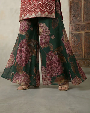 -Product Name: Blood-Red Banarasi-Brocade-Sequin-Embroidery Kurti , Floral Palazzo & Dupatta Set.