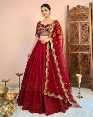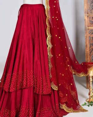 -Product Name: Blood-Red Synthetic-Silk Zari-Brocade-Stonework Double-Layer Lehenga, Blouse & Dupatta Set.