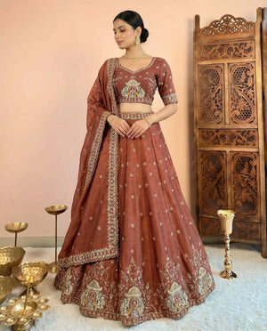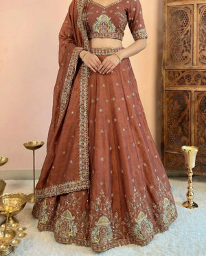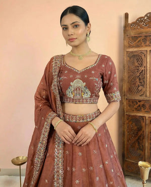 -Product Name: Brown-Rust Crush-Chinnon Thread-Embroidery Lehenga, Blouse & Dupatta Set.