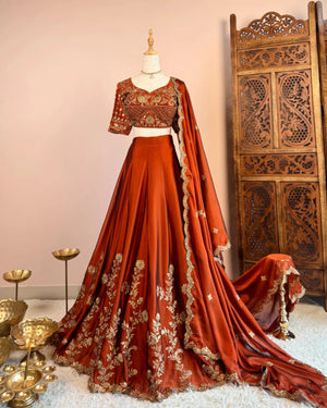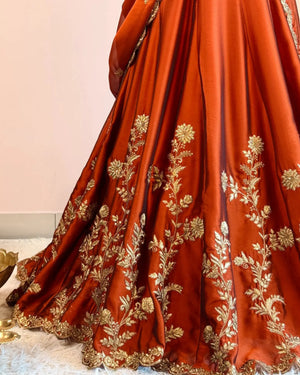 Burnt-Orange Soft-Tissue Zari-Embroidery Kalidaar-Lehenga, Blouse & Dupatta Set.