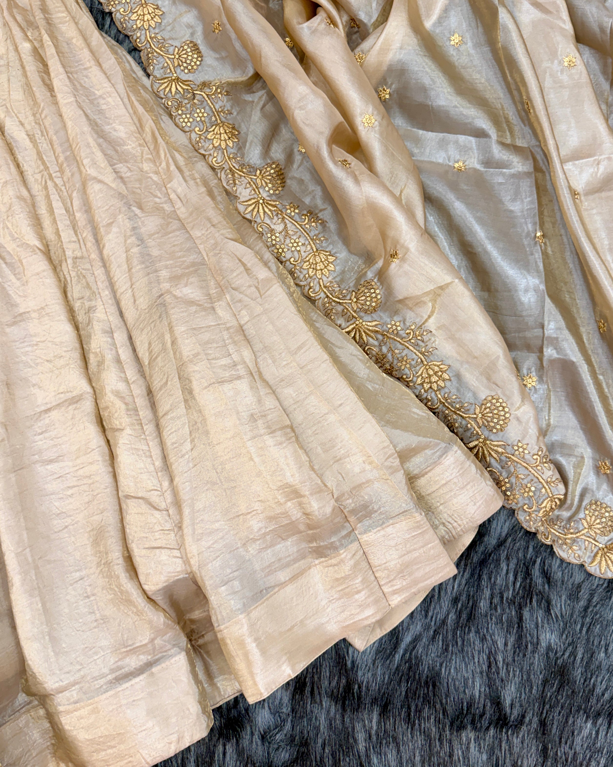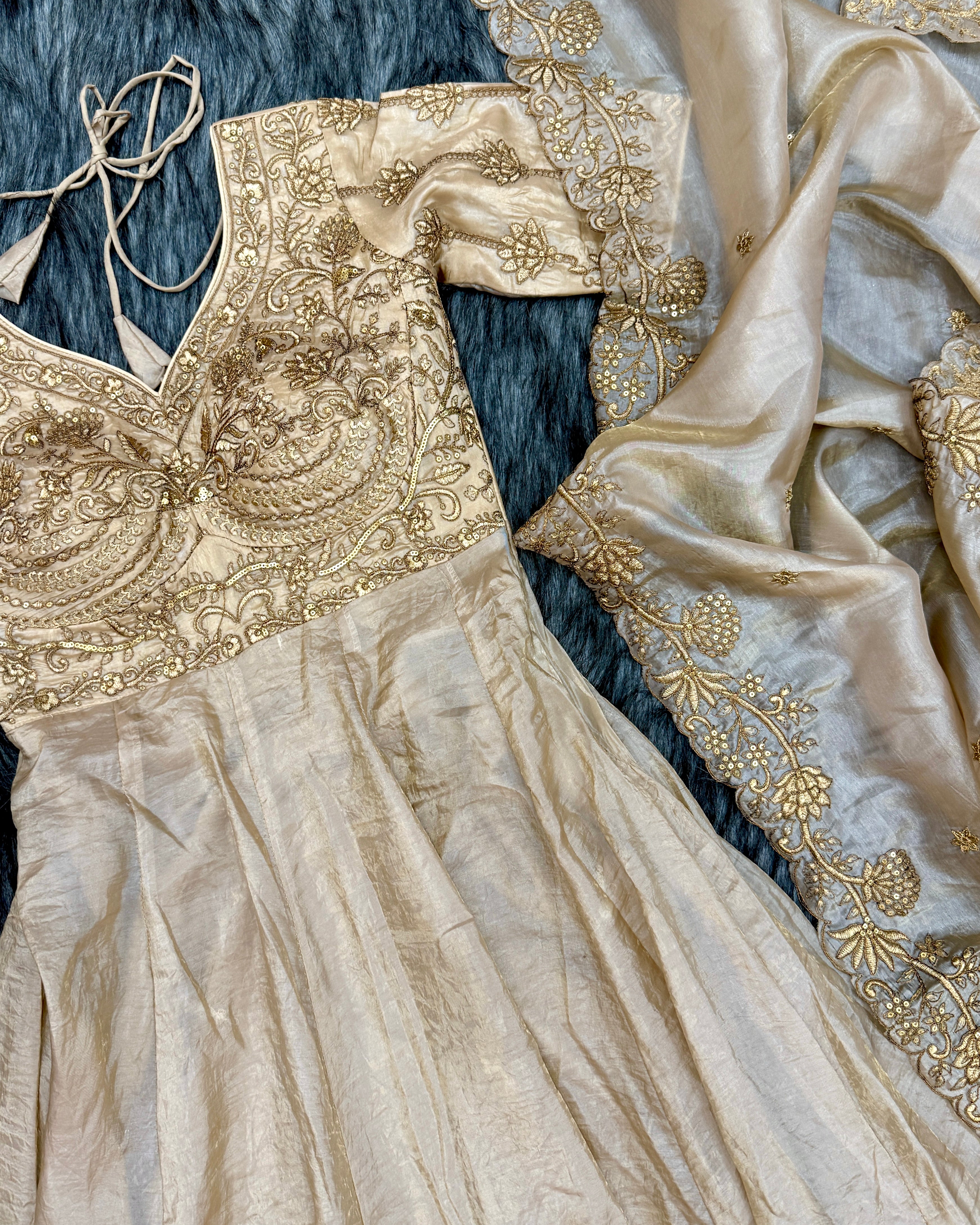 Champagne-Gold Tissue-Silk Zari-Embroidery Gown-Anarkali, & Dupatta Set.