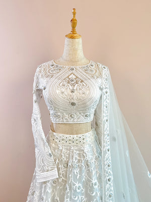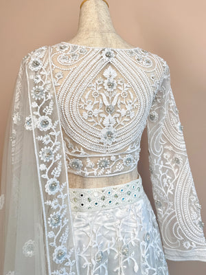-Product Name: Pure-White Tulle-Net Pearl-Embroidered Kalidaar-Lehenga-Blouse-Dupatta-Set