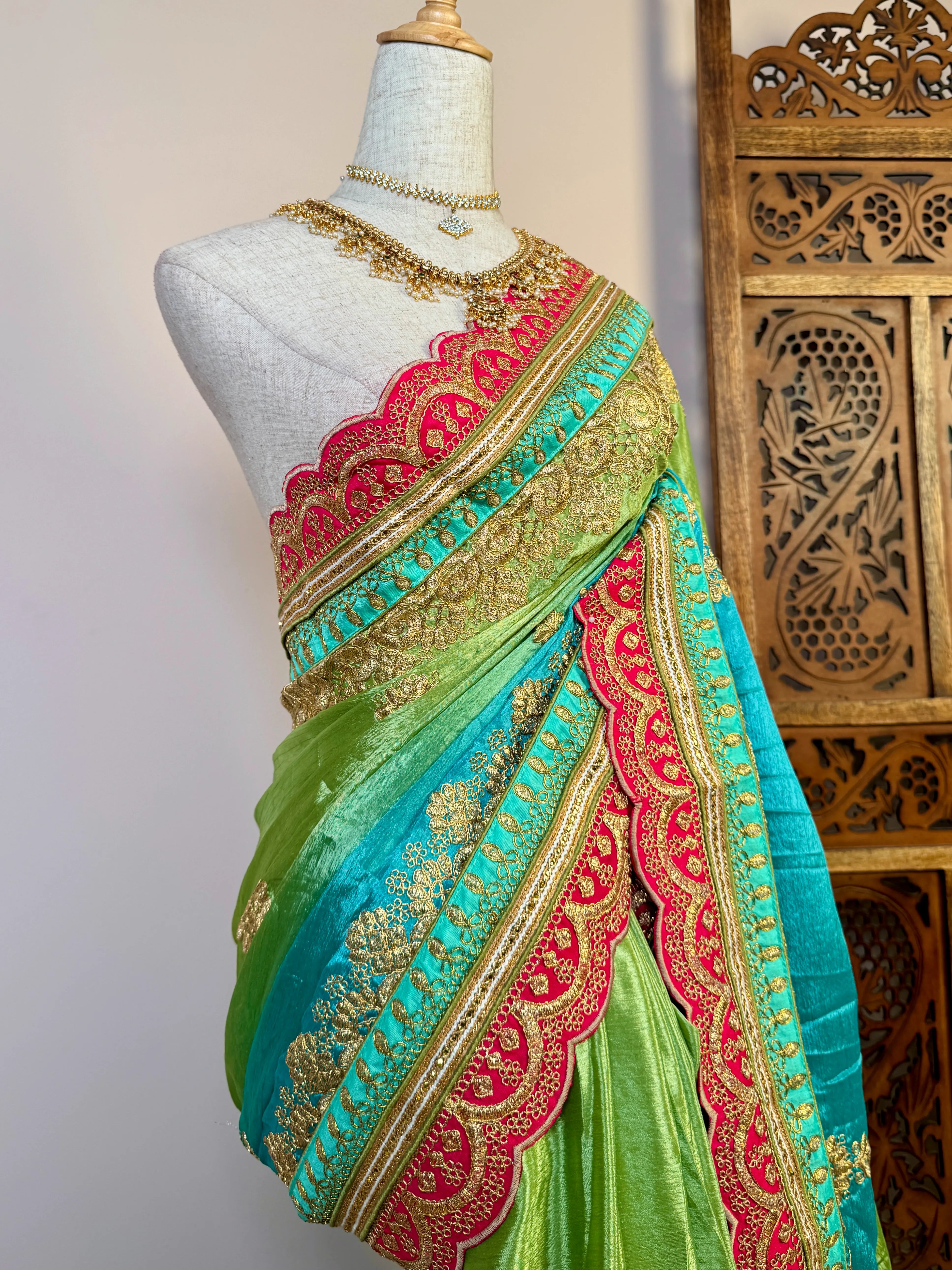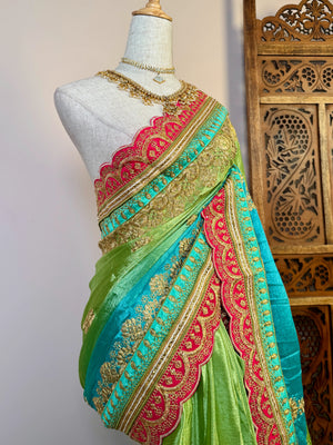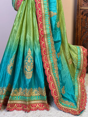 Turquoise-Green Soft-Silk Grand Heavy-Embroidered-Border North-Saree