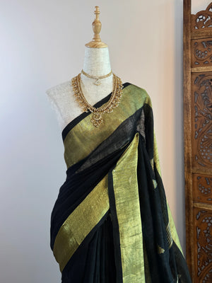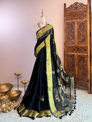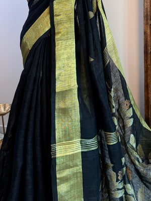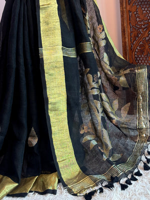 Black-Gold Handloom Pure-Linen Floral-Pallu Bengal-Saree
