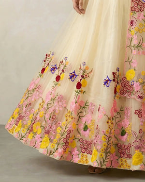 -Product Name: Cream Tulle-Net Multi-Thread-Embroidery Lehenga, Blouse & Dupatta Set.
