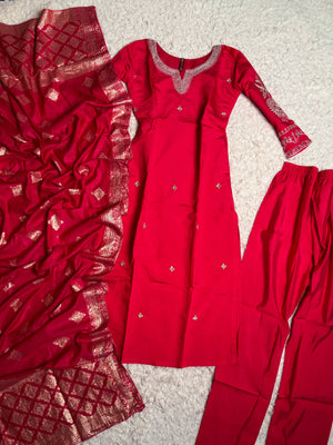 -Type: Dark-Pink Crepe-Silk Zari-Embroidery Kurti-Pants-Banarasi-Dupatta-Set