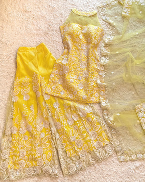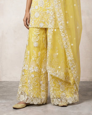 -Product Name: Light-Yellow Thread-Sequin-Embroidery Halter-Neck Kurti Sharara Pants & Dupatta Set.