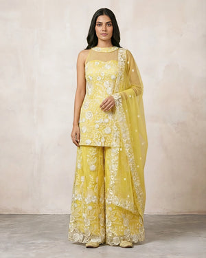 Light-Yellow Thread-Sequin-Embroidery Halter-Neck Kurti Sharara Pants & Dupatta Set.