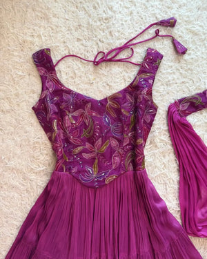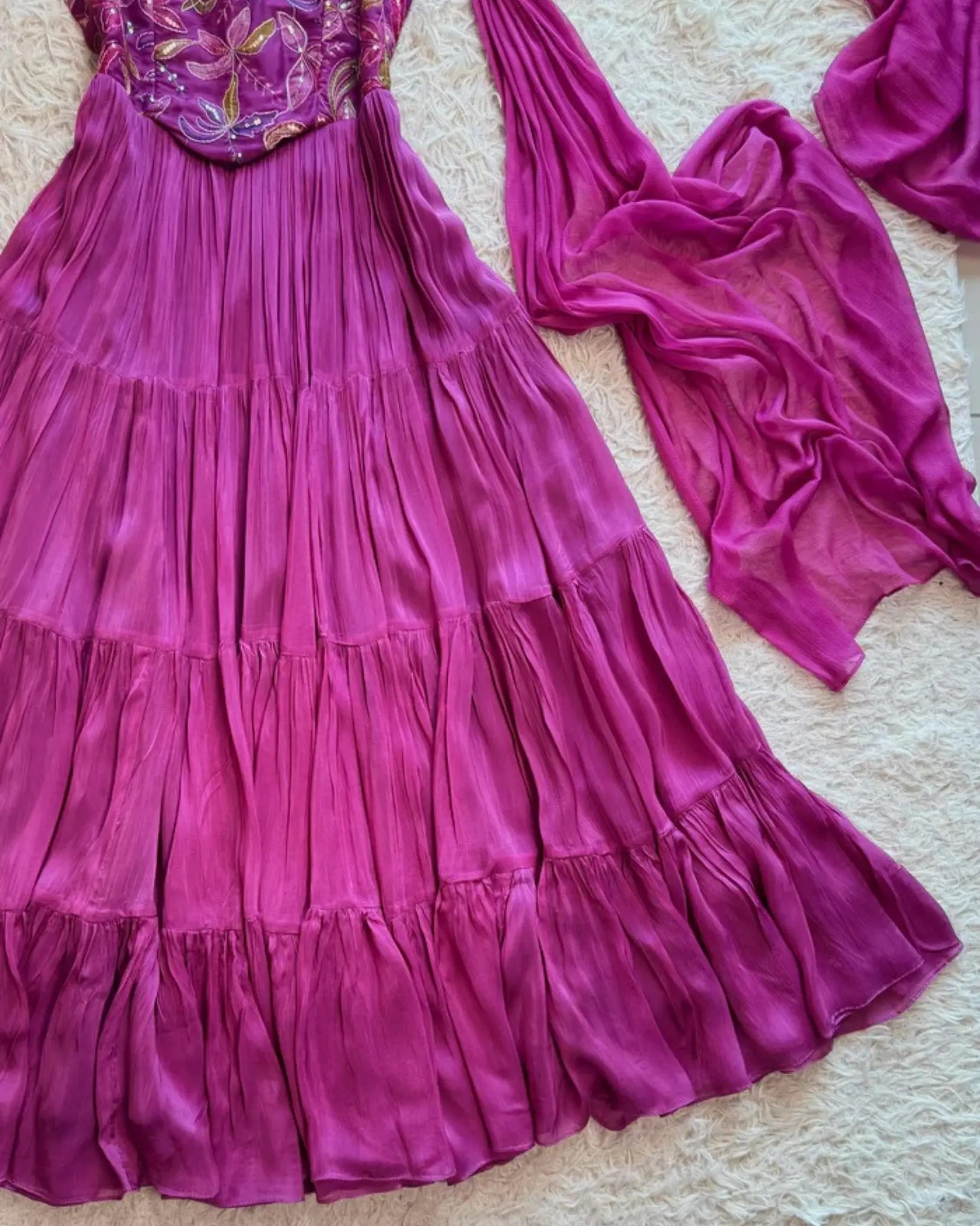 -Product Name: Lilac Tabby-Silk Corset-Yoke Multi-Layer Anarkali & Dupatta Set.
