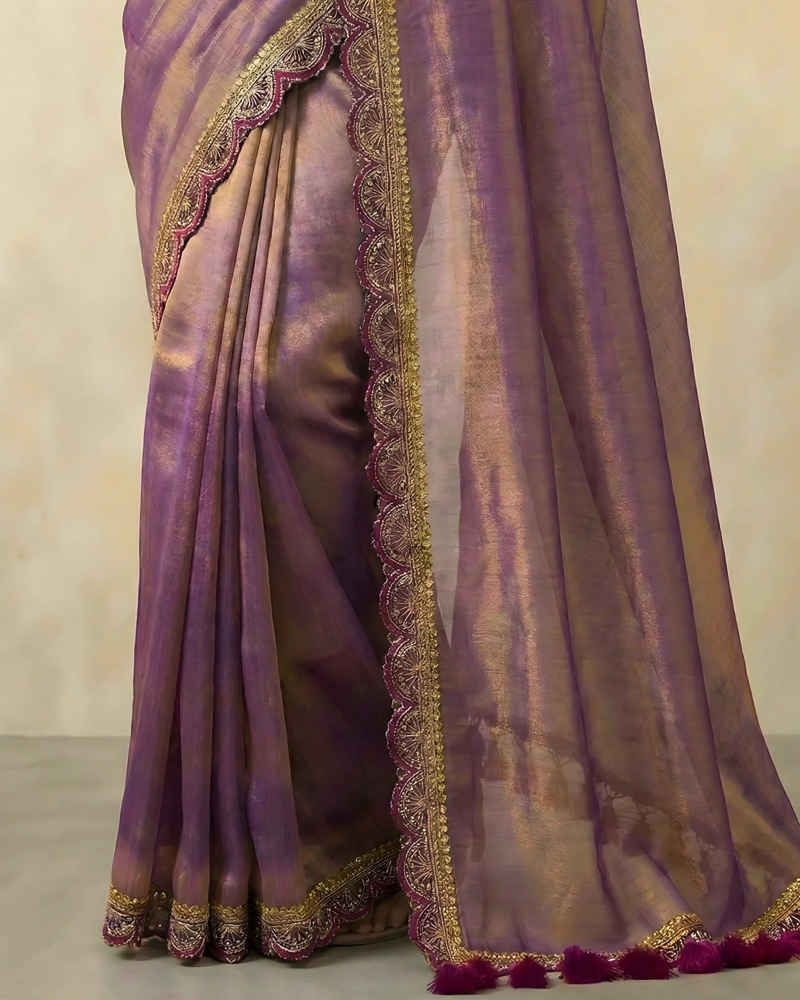 Lavender-Purple Cotton-Tissue Fancy-Border Handloom Bengal-Saree