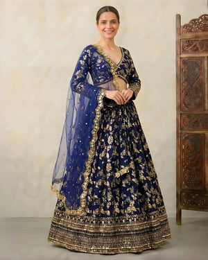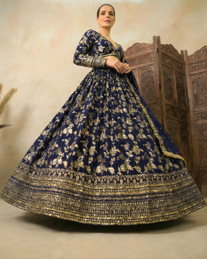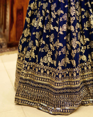 -Product Name: Navy-Blue Banarasi-Brocade Sequin-Embroidery Pleated Lehenga, Blouse & Dupatta Set.