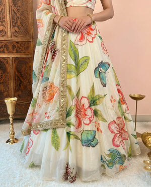 Off-White Crepe-Silk Floral-Printed Cut-dana-Pearl Highlight Lehenga, Blouse & Dupatta Set.