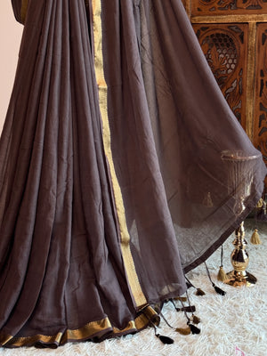 Coffee-Brown Handspun Pure-Cotton Zari-Patta Bengal-Saree