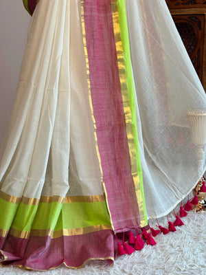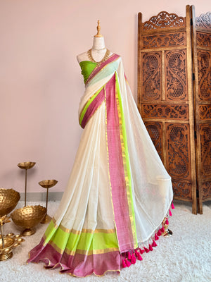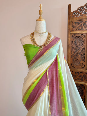 Off-White-Green-Pink Handspun Pure-Cotton Ombre Bengal Saree