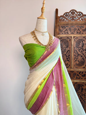 -Product Name: Off-White-Green-Pink Handspun Pure-Cotton Ombre Bengal Saree