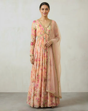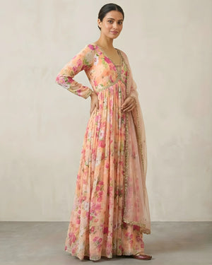 -Product Name: Pastel-Peach Floral-Print Georgette Dress-Style Anarkali & Dupatta Set.