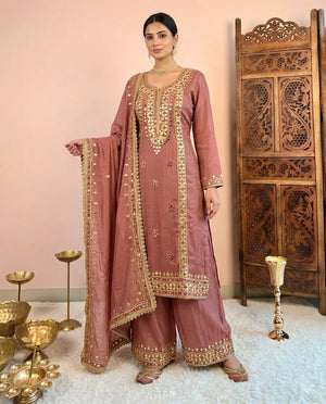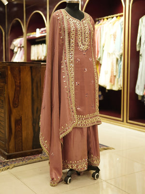 Pinkish-Brown Mirror-Gota-Embroidery Silken-Tissue Kurti Suit , Palazzo Pants & Dupatta Set.
