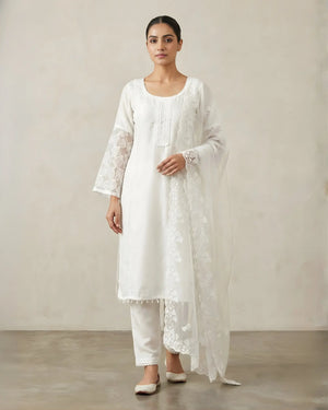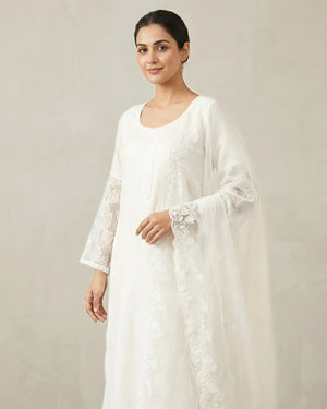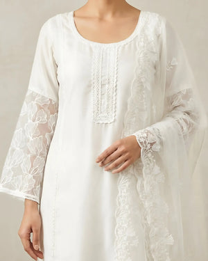 Pure-White Synthetic-Silk Crochet-Lace-Embroidery Straight Suit Pants & Dupatta Set.