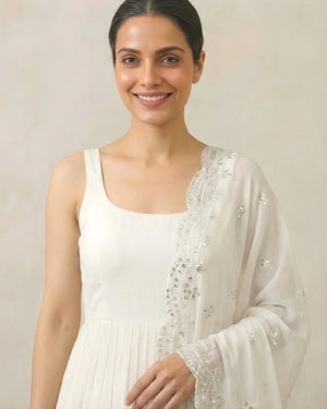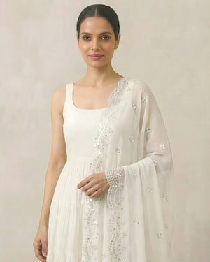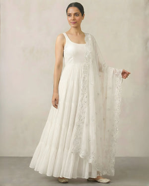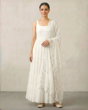 Pure-White Viscose-Georgette Plain-Tiered Anarkali-Dress, Pants & Dupatta Set.