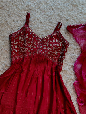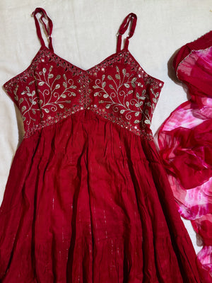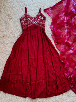Rani-Pink Zari-Muslin Embroidered Flare-Anarkali-Kurti-Dupatta-Set