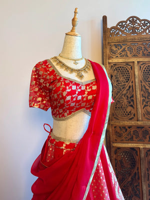 -Product Name: Red-Mauve Pink Banarasi-Brocade Multi-kalidaar Lehenga-Blouse-Dupatta-Set