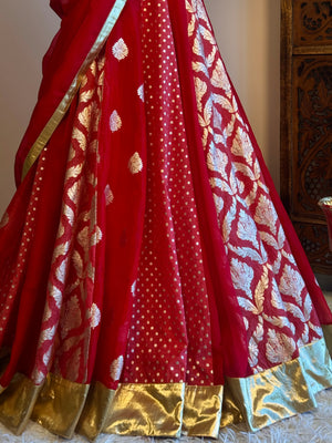 Red-Mauve Pink Banarasi-Brocade Multi-kalidaar Lehenga-Blouse-Dupatta-Set