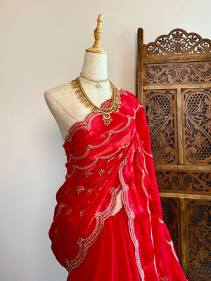 Chilli-Red Silken-Tissue Crown-Designed North-Saree