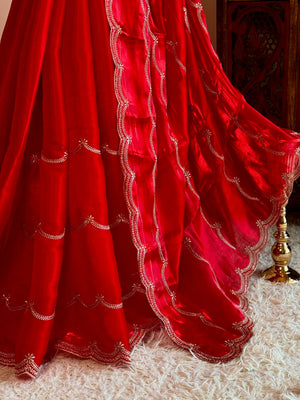 -Product Name: Chilli-Red Silk-Tissue Crown-Designed North-Saree