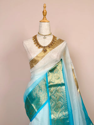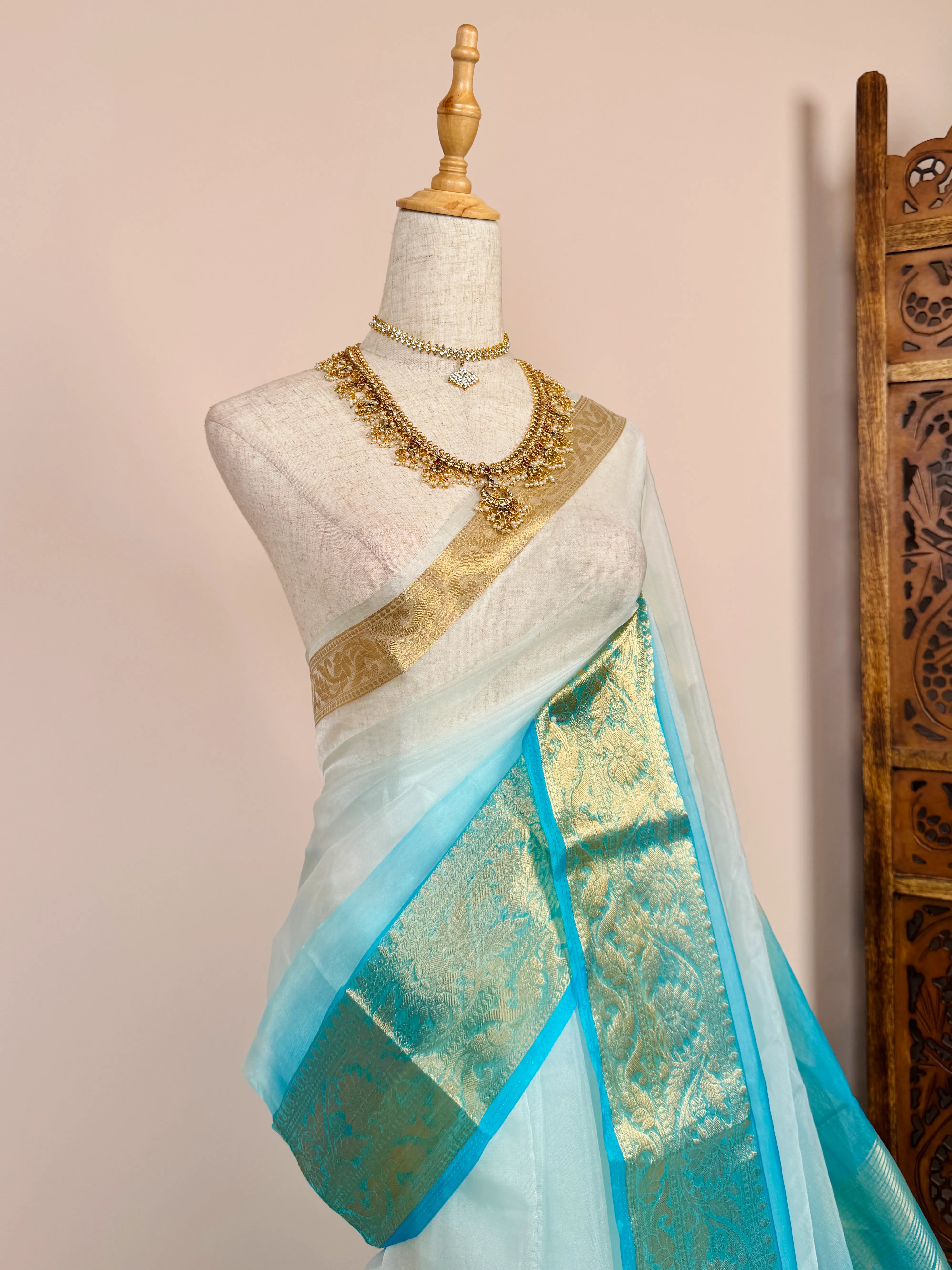 White-Sky blue Silken-Organza Woven-Border Hand-Dyed North-Saree