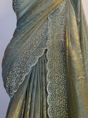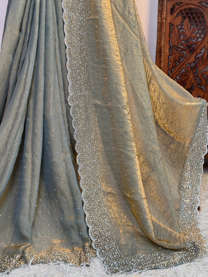 Double-toned Turquoise Silk-Tissue Stonework-Border North-Saree