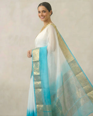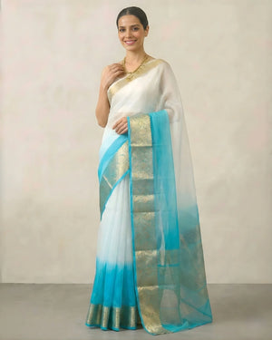 White-Blue-Ombre Organza Zari-Border Banarasi-Saree