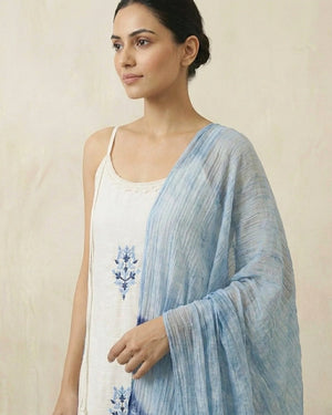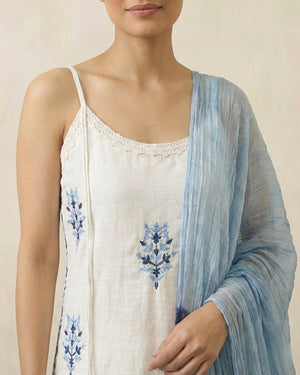 White Cotton-Slub Thread-Embroidery Kurti-Top , Pants & Dupatta Set.