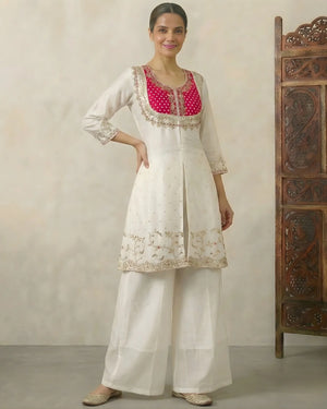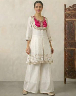 -Product Name: White-Pink Cotton-Silk Zari-Embroidery Front-Slit Kurti-Top & Palazzo Co-Ord Set.