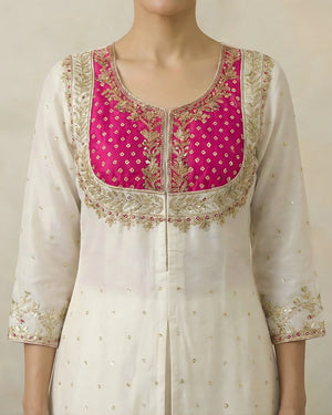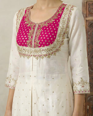 White-Pink Cotton-Silk Zari-Embroidery Front-Slit Kurti-Top & Palazzo Co-Ord Set.