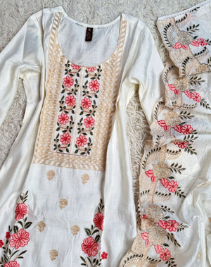 White Crepe-Silk Embroidered Premium Kurti-Pant-Dupatta-Set