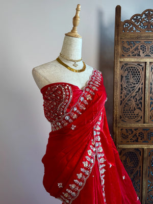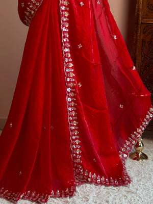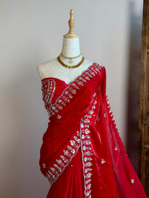 Chilli-Red Silken-Tissue Stonework-Border-Cutwork Grand-Blouse North-Saree