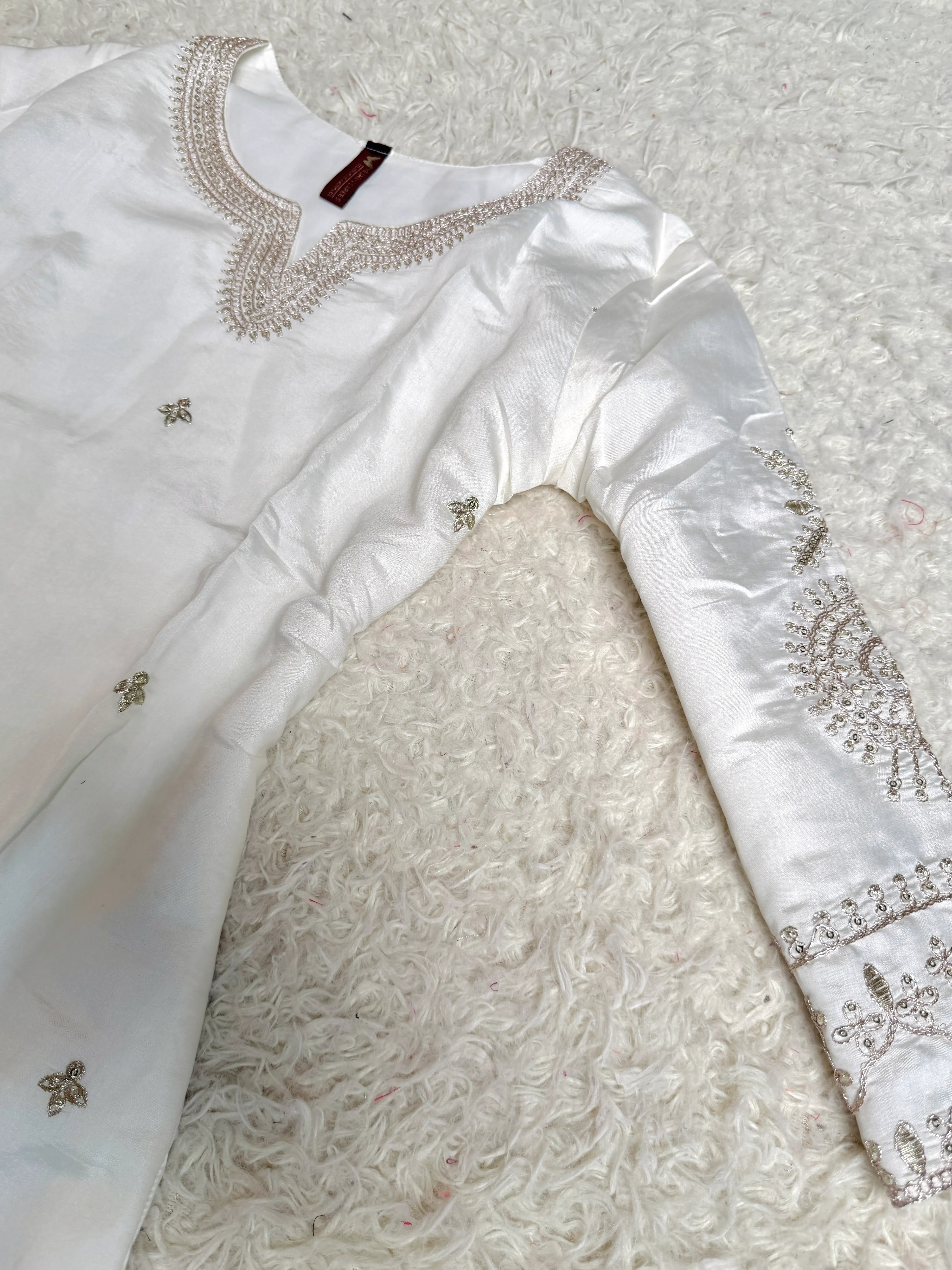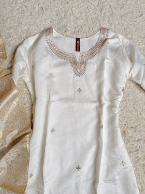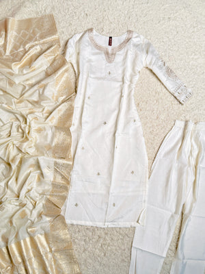 White Crepe-Silk Zari-Embroidery Kurti-Pants-Banarasi-Dupatta-Set