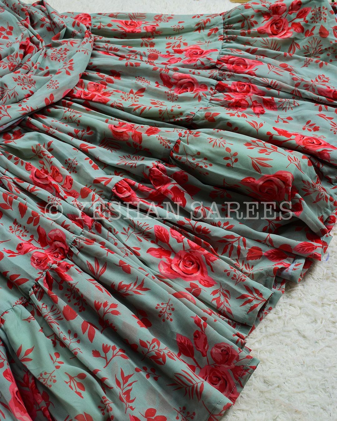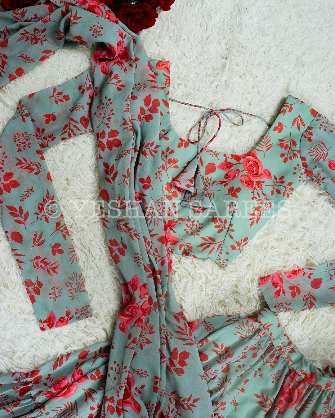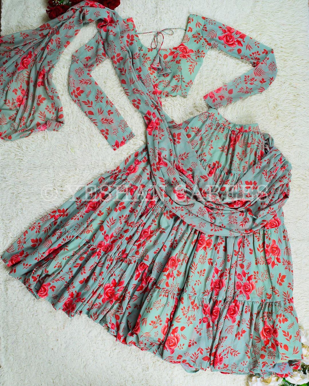 -Product Name: Mint Georgette floral-Print Multi-Layer Pleated-Lehenga Skirt , Blouse & with attached Dupatta Set
