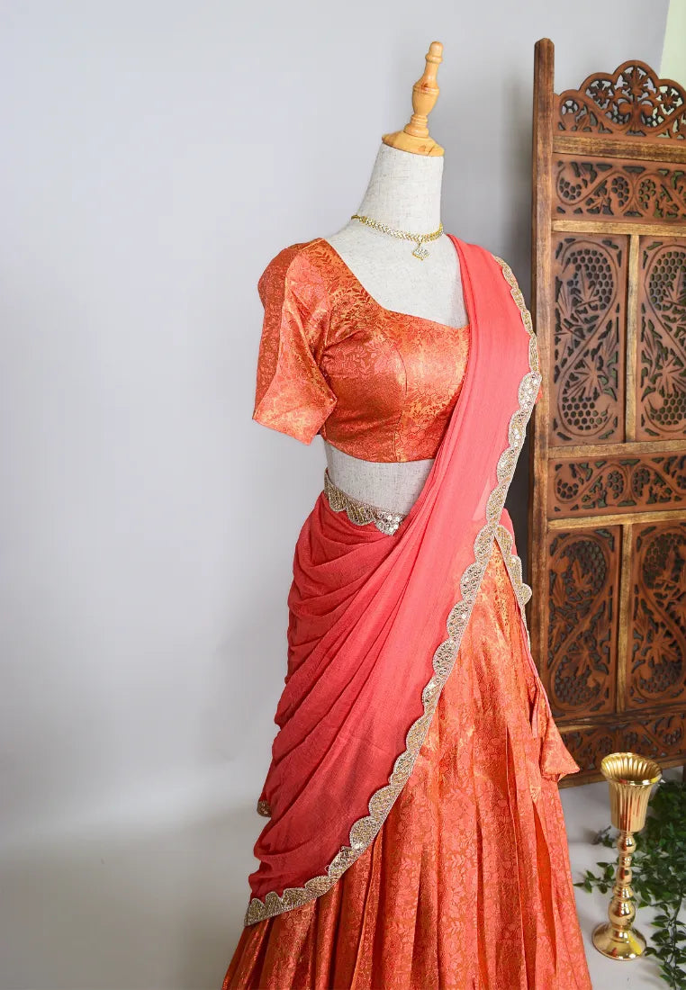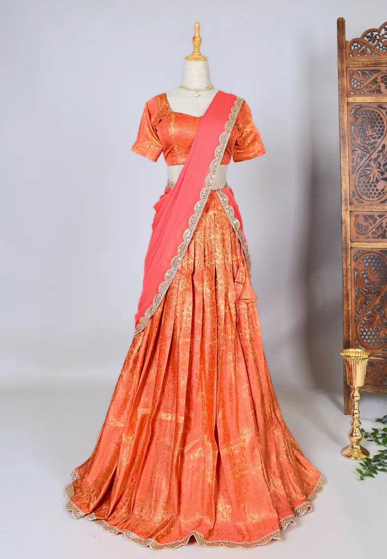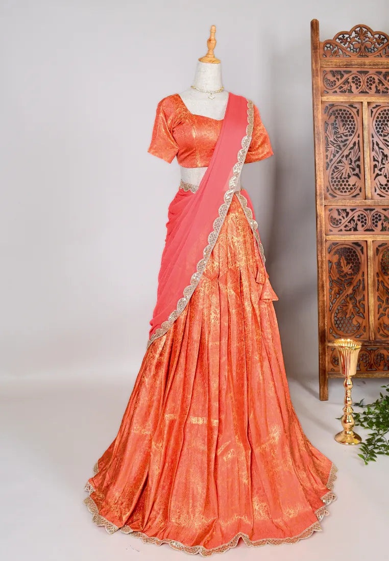 Peach Brocade-Woven art-Silk Pleated-Lehenga, Blouse & Dupatta SetPeach Brocade-Woven art-Silk Pleated-Lehenga, Blouse & Dupatta Set