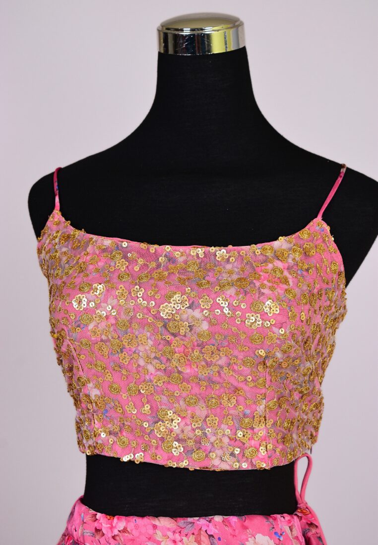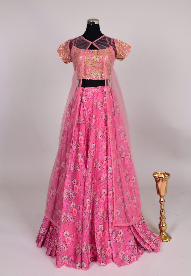 -Product Name: Pink Organza Digital Print Lehenga Skirt Blouse Cape Set