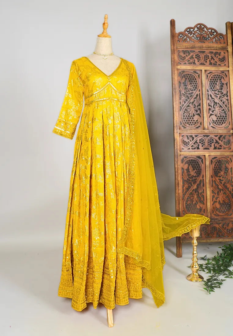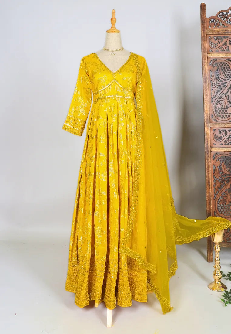 -Product Name: Yellow Zari-Woven-Embroidery Art-Silk Box-Pleated Anarkali-Kurti & Dupatta Set